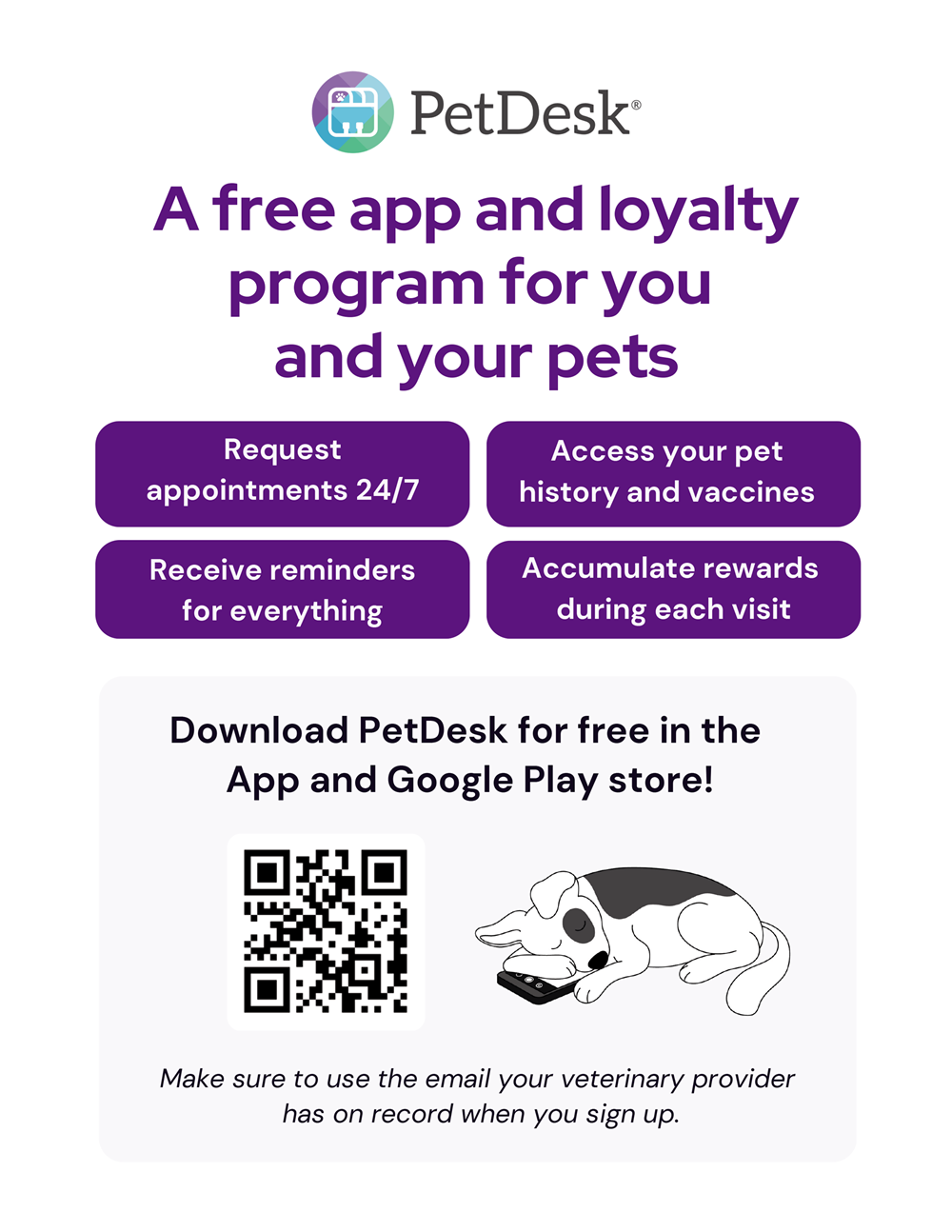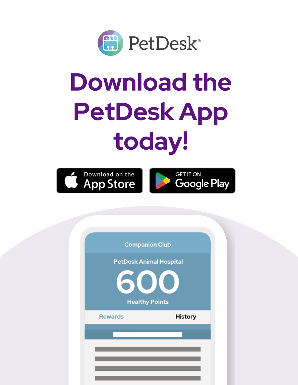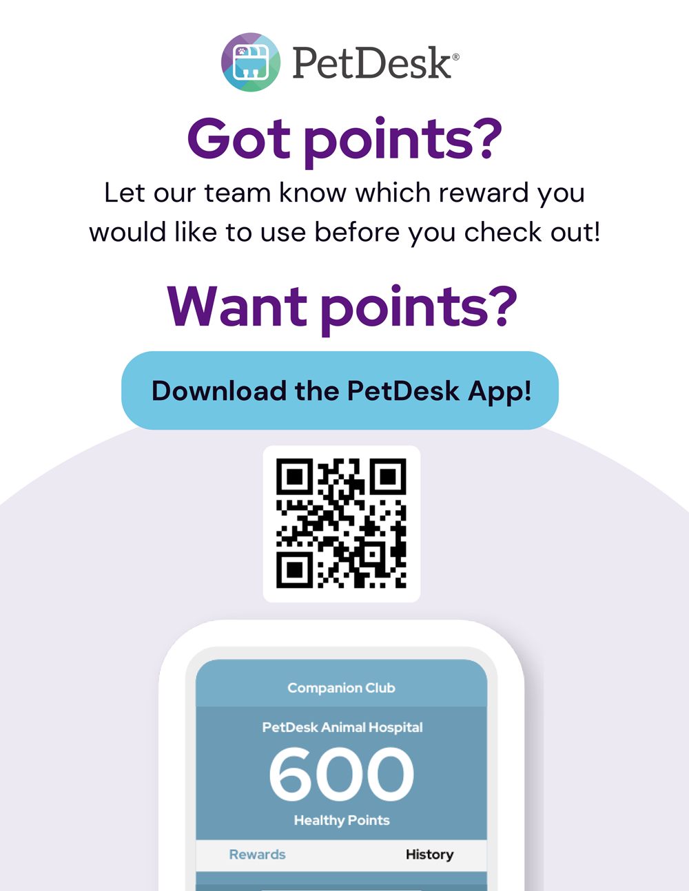 Earn points and rewards through our PetDesk loyalty program — just download the app to get started!